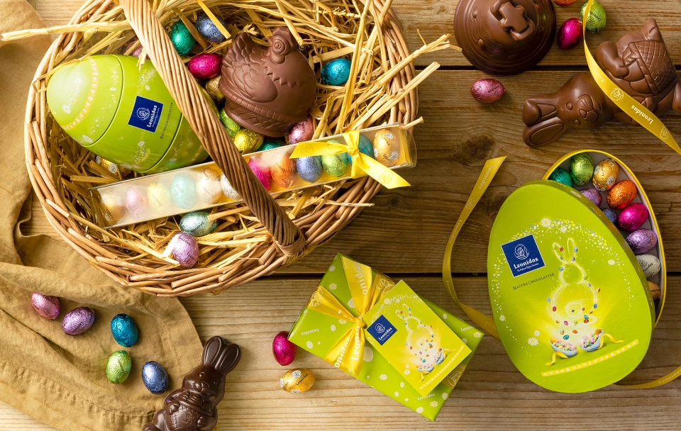 Desigur, editia speciala include si produsele Leonidas din ciocolata belgiana de sezon. Miniouale de ciocolata sunt invelite individual in folie colorata, fiecare culoare invocand o aroma si o compozitie unice. Nu lipsesc jumatatile de ou umplute cu praline sau figurinele de ciocolata. Simpaticele figurine pot fi iepurasi, cocosi, oua de diferite dimensiuni, din ciocolata cu lapte sau neagra.